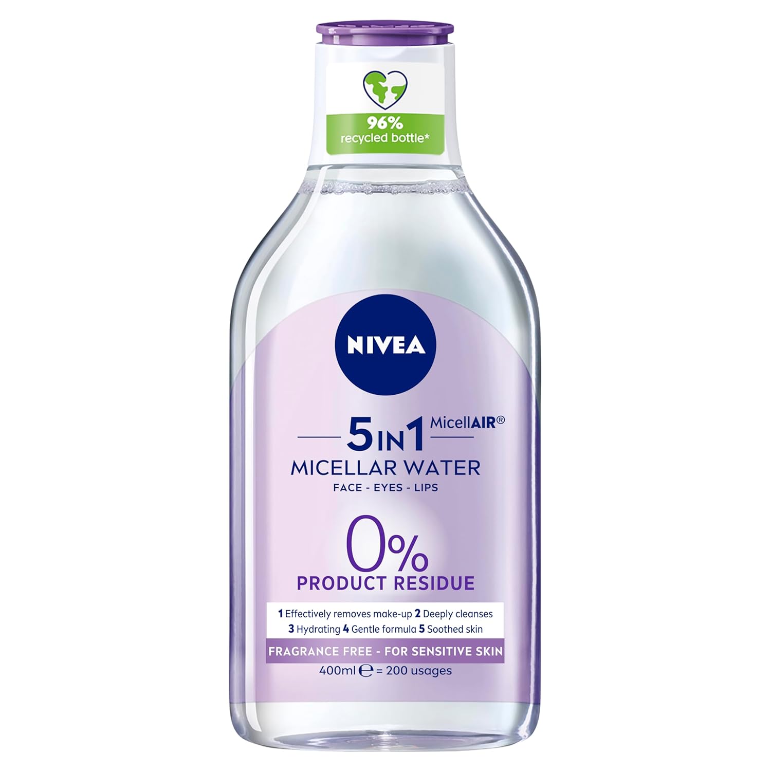 NIVEA Micellar Sensitive Micellar Water 400ml – Effectively removes make-up, cleanses and tones the skin without leaving residue Micellar Sensitive Micellar Water from NIVEA effectively removes make-up without the need to rub or strain delicate sensitive skin. Its microscopic micelles work to gently lift make-up and dirt from the skin to leave it free of impurities. The formula is especially developed for sensitive skin, to gentle cleanse and remove excess sebum without drying out the skin, leaving it feeling refreshed and healthy-looking. The formula is made with no animal-derived ingredients and the bottle is made from 96% recycled material.